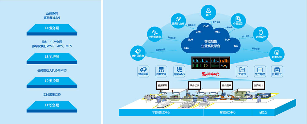 智能制造不但要生產(chǎn)自動(dòng)化、信息化,更需跨業(yè)務(wù)層級(jí)整合信息系統(tǒng),實(shí)現(xiàn)業(yè)務(wù)層、執(zhí)行層、監(jiān)控層、設(shè)備層的互聯(lián)互通。MES系統(tǒng)是鏈接業(yè)務(wù)層與設(shè)備監(jiān)控層的橋梁,通過(guò)MES可以實(shí)時(shí)掌控生產(chǎn)進(jìn)度與監(jiān)控異常。